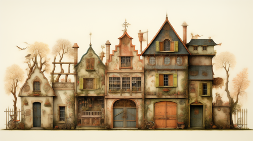 illustration of the exterior of an ornate whimiscal multitenant home in a 1700s French Fairytale, --ar 16:9 --stop 80