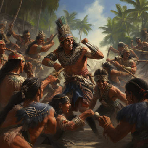 lamanites fighting the nephites from the book of mormon. The lamanites are dressed in loincloths and the nephites are dressed in mayan armor. Hyper realistic.
