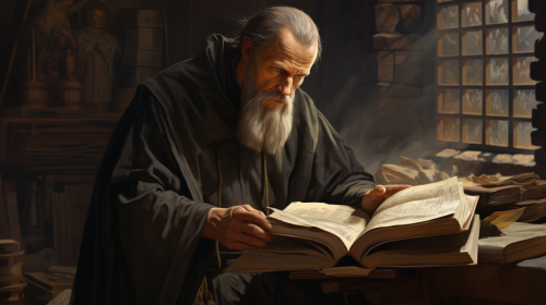 medieval Russian monk looks at the Bible with contempt --ar 16:9