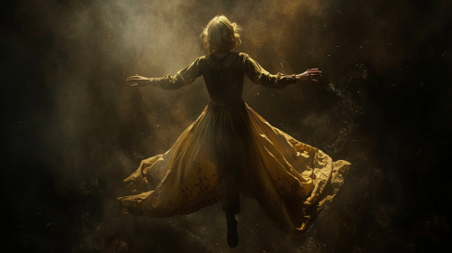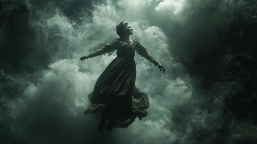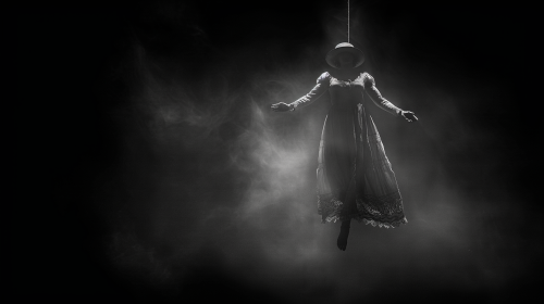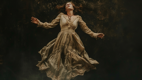 30 year old lifeless woman dressed in Western United States frontier dress suspended in frightening black formless void from 50 foot focal length shaft of faint light from above --ar 16:9 --v 6.0 --s 250 --style raw