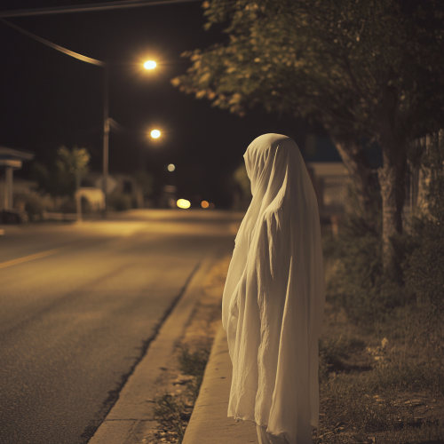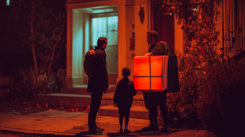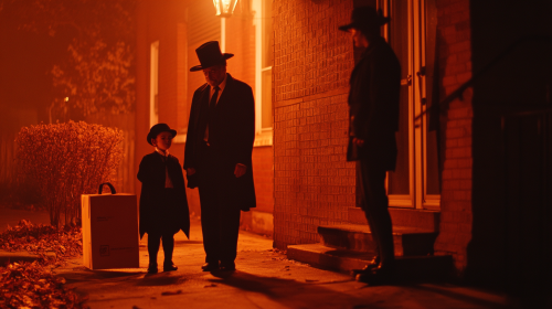 movie still, documentary photography, editorial, Martin Parr style off-centered shot of a dad and his son, both in vampire costumes, a delivery person stands near Cinematic orange halloween lighting, 35mm, intricate details --ar 16:9
