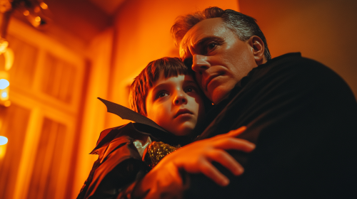 movie still, documentary photography, editorial, Martin Parr style off-centered shot of a dad and his son, both in vampire costumes, Cinematic orange halloween lighting, 35mm, intricate details --ar 16:9