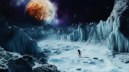 a zombie movie poster about a base on a frozen moon of Jupitor. In the background show Jupitor in the top left side of the image. On the right side of the image show a moon frozen over by ice. in the foreground is a frozen zombie floating in space. Use bright vibrant colors. --ar 16:9