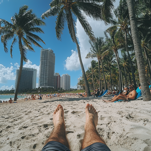 photo of miami beach vaction from the POV of a tourist, you see the bottom of their feet and legs but they are a ghoul so the legs and feet are ghoulish --q 2 --s 250
