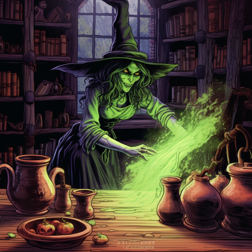 a Halloween witch, using a potion book to create a green bubbling liquid in a cauldron, behind her is a wicked looking house with potion bottles and spell books on dusty shelves, photorealistic --v 5.1