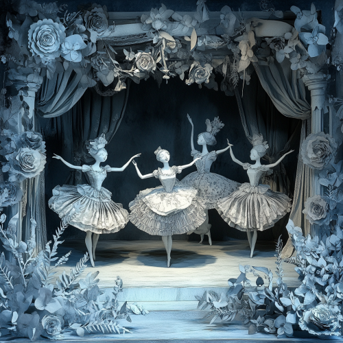 Create a surreal and whimsical scene in the style of Edward Gorey, set in a dark and mysterious puppet theater adorned with fairy-like figures and intricate paper flowers. The room is dimly lit, casting long shadows, with each puppet suspended in mid-air, frozen in a dance-like pose. Employ meticulous cross-hatching to enhance the textures of their elaborate costumes--ruffled skirts, delicate lace, and embroidered patterns--while using fine linework to bring out every detail in the flowers, fabrics, and props scattered around the room. The characters should have simplified yet unsettling expressions, embodying a detached elegance, with exaggerated proportions typical of Gorey’s work. Surround the figures with symbolic objects--perhaps a worn-out clock, masks, or broken wings--hinting at themes of time, identity, and fragility. These elements should subtly evoke a deeper narrative, encouraging the viewer to imagine hidden stories within the scene. Use the negative space effectively to emphasize isolation, ensuring the cluttered stage still feels spacious and eerie. While the environment appears chaotic, every element should serve to heighten the quiet tension, capturing the dreamlike melancholy characteristic of Gorey’s world. The overall composition should feel like a moment suspended in time--beautiful, strange, and slightly unsettling--where the whimsical meets the uncanny.
