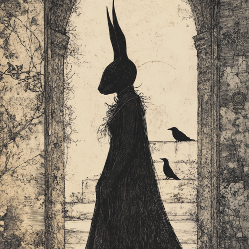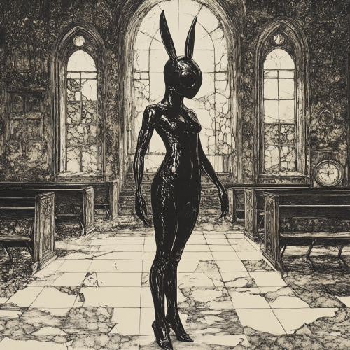 Create a surreal and haunting illustration in Edward Gorey’s signature style, depicting a humanoid rabbit figure clad in sleek black attire. Use meticulous cross-hatching to render the latex material with depth and texture, emphasizing the interplay of light and shadow on the reflective surface. The figure should stand upright, her posture neutral and poised, exuding both elegance and unease. Her mask-like rabbit face should remain expressionless, reflecting Gorey’s theme of emotional detachment and ambiguity. The setting should resemble an abandoned, decayed chapel with broken pews and remnants of stained-glass windows in the background. Render these elements with fine linework to convey both the beauty and decay of the space, creating a sense of timeless melancholy. Include minimal but symbolic objects--such as an old clock partially buried in dust or a lone black bird perched on a cracked window--hinting at themes of time, loss, and mystery. The composition should make effective use of negative space, with much of the background fading into shadow, enhancing the feeling of isolation. The overall scene should evoke a tension between elegance and discomfort, where the surreal presence of the rabbit figure contrasts with the ruined surroundings. This eerie balance between beauty and unease captures the essence of Gorey’s narrative style, leaving the meaning open to interpretation.