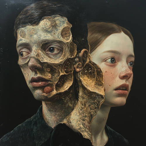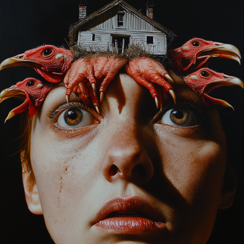 the face of a woman who has a chicken on her head and the chicken's paws are on her forehead, her claws are digging into the skin of her forehead, demon, portrait, realistic