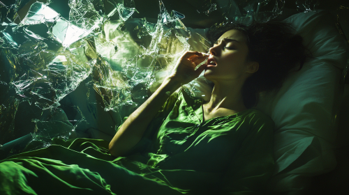 Woman sitting in bed at night in green sheets and holding on to a sore throat, sharp shards of glass levitating around her neck, advertising quality, photographic quality --ar 16:9 --v 6.1