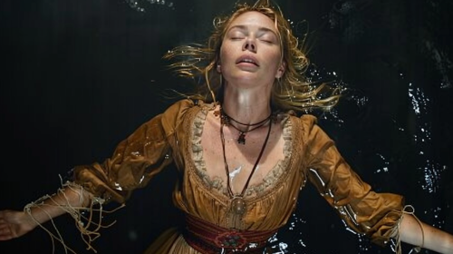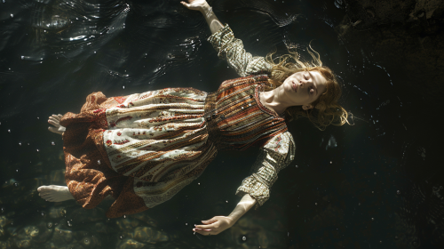 30 year old lifeeless woman dressed in Victorian era Western United States settler frontier dress floating in frightening black abyss from 50 foot focal length hint of light far above --ar 16:9 --v 6.0 --s 250 --style raw