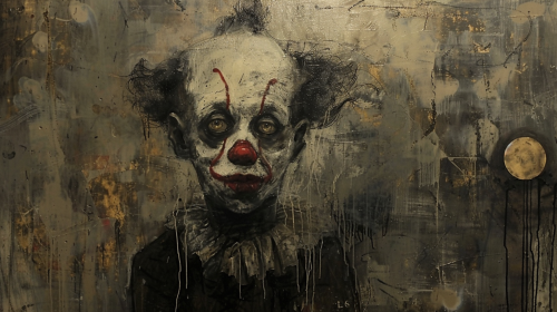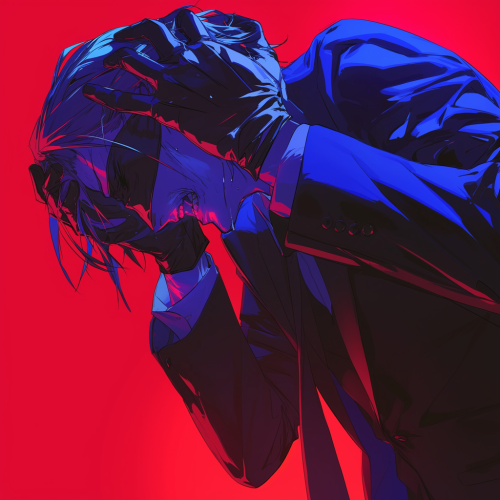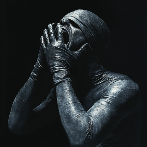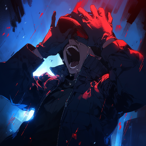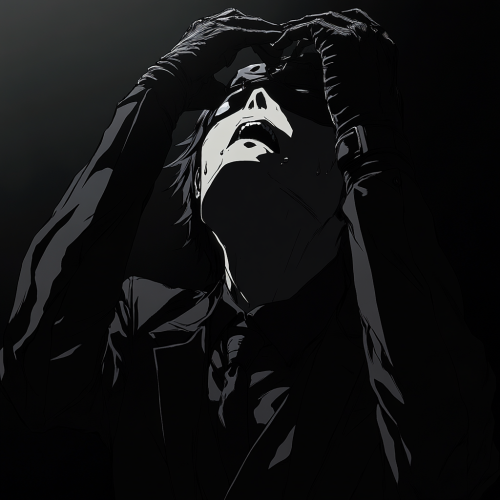 Dark illustration of a man screaming in agony. Full body side shot. Wearing leather gloves and a textile balaclava. His hands are touching his forehead.