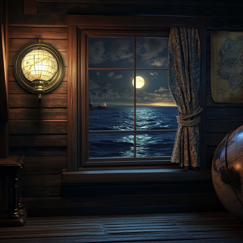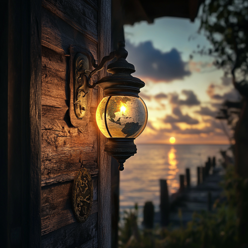 the old gasslighting movie set with the gasslight sconce with the flame as the globe of the earth glowing cozy seaside cabin ocean throgh thw woindow, evening moonlit