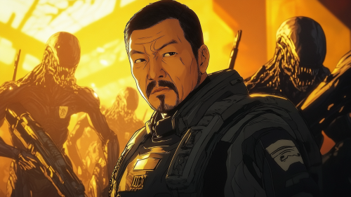 a handsome Asian male Colonial Marshal leading a squad of Colonial Marines through a Xenomorph hive, anime-style, James Cameron, Ridley Scott, --ar 16:9