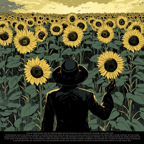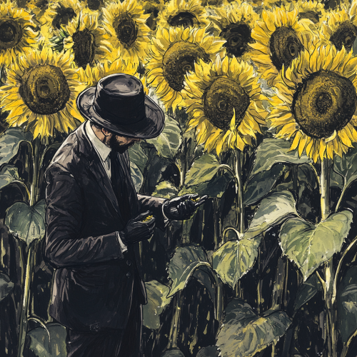 "A man in a black Amish style suit with a wide-brimmed hat and black gloves, shown from a behind and side angle, stands in a sunflower field. He is carefully picking a solitary seed from the face of a tall sunflower that is at eye level with him. The scene is waist-up, with dozens of towering sunflowers surrounding him to the left, right, and rear. The lighting is dramatic, casting deep shadows. The color palette is muted and earthy, with dark greens, yellows, and blacks. The mood is eerie and unsettling, with detailed linework in the style of Bernie Wrightson’s classic horror comics. v6 4k ar 2:4"