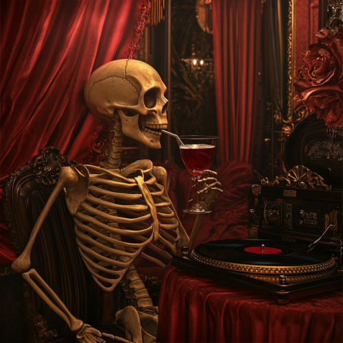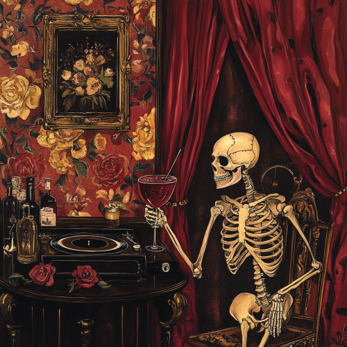 a skeleton drinking a cocktail in a jazz bar with a record player in the background; the aesthetic is spooky 1920's & 1930's with dark shades of red, gold and black. curtains are wine red