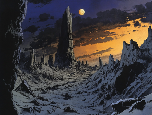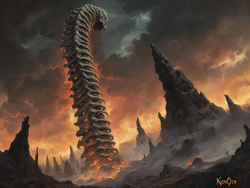 The crooked spine of a dead god rises as the bone tower of Khin-Oin from the Dungeons and Dragons Planescape setting is rising in the distance above the Gray Wastes of Hades. --ar 4:3