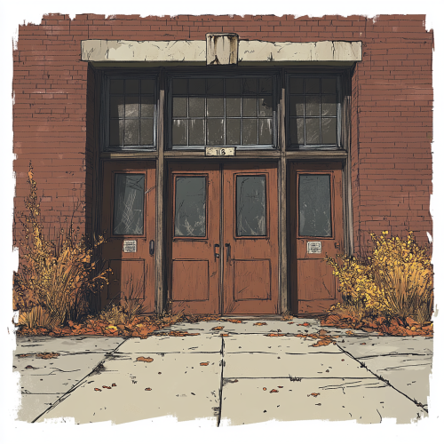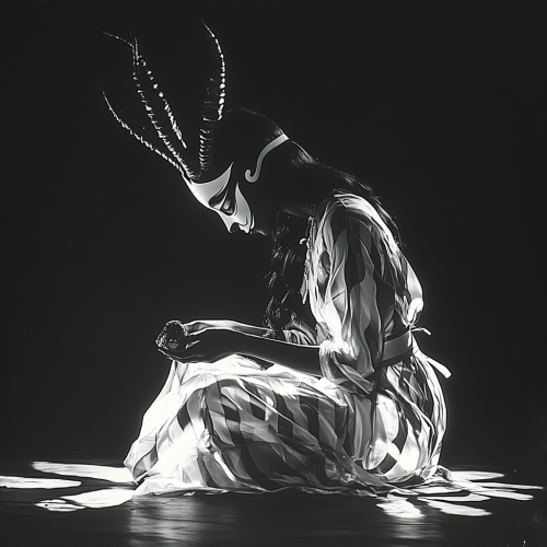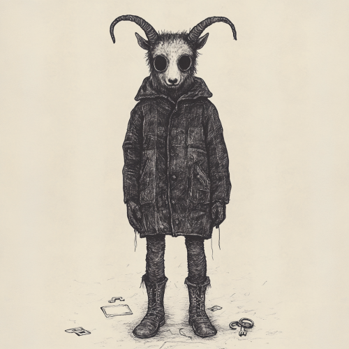 Generate an illustration in the style of Edward Gorey, depicting a mysterious figure wearing a patchwork jacket, gloves, and heavy boots. The figure has a surreal animal mask with goat-like horns and blank, hollow eyes, creating an eerie, detached expression. Use intricate cross-hatching to emphasize the texture of the clothing, capturing every frayed stitch and worn detail. The character's silhouette is slightly awkward and child-like, with a stiff posture, evoking both innocence and discomfort. Maintain a muted, minimal background with soft shadows, allowing the figure to stand out. Add subtle symbolic elements like dangling keys, broken dolls, or faint, torn sketches scattered across the floor--implying a story of forgotten memories and isolation. The overall tone should strike a delicate balance between whimsy and unease, characteristic of Gorey’s peculiar, haunting worlds.