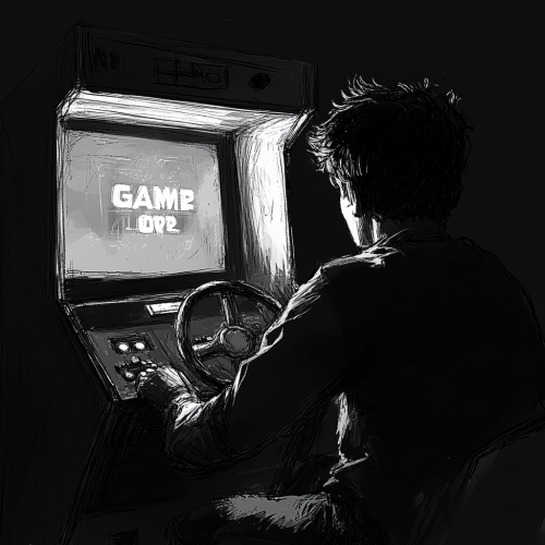 Black-and-white Tim Burton-style sketch, 3/4 view of a young man sitting at an old arcade racing game, the young man is in silhouette, hands on the steering wheel, 'Game Over' displayed on the arcade screen in glowing letters, dramatic lighting from the screen casting shadows, moody and eerie atmosphere, high contrast between light and darkness, exaggerated and whimsical linework, no colors