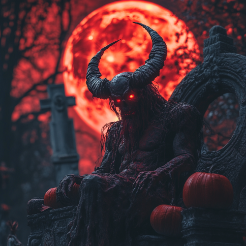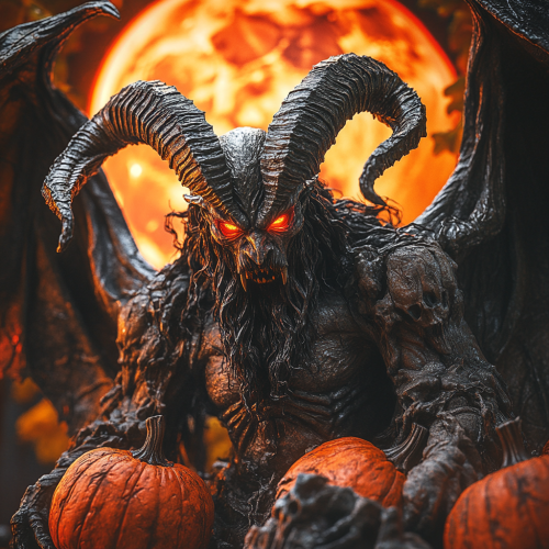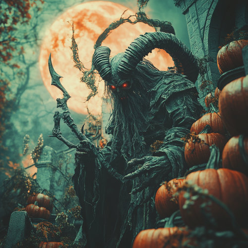 close up Baphomet fighting and surrounded by evil scary Halloween pumpkins in an old cemetery orange red moon, eclipse surreal horror --style raw --v 6.1 --s 250