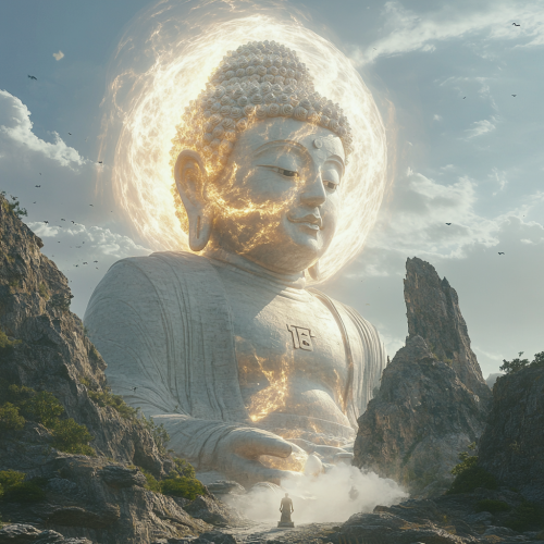 Giant Buddah statue on the mountain, engulf by a white fireball, make the fireball crystal white, the Buddah statue is getting destroyed piece by piece