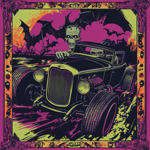 Tour poster. Frankenstein’s monster driving s an American hot rod , With space for text in the bottom. With a little bit of neon colors, Borders around the poster with grim ornaments, grim dark art, 1940s horror comic book stye. knives, bats and snakes --v 6.1