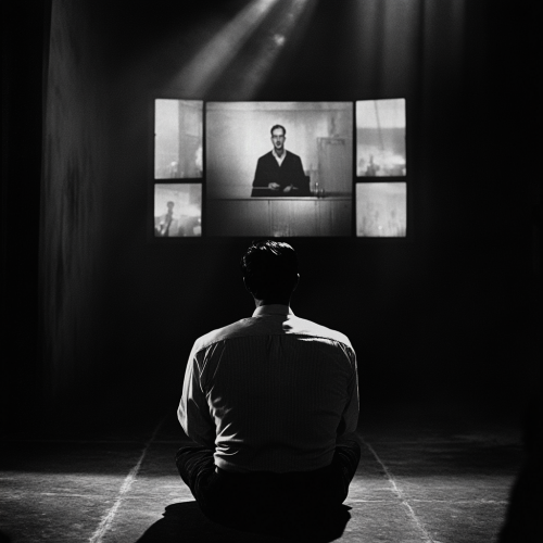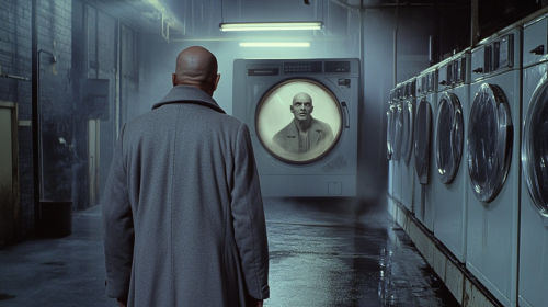 Exttreme Close up Rear angle of the back of a bald Telly Savalas head wearing a grey longcoat on a loading dock surrounded by washing machines walking towards a huge gigantic massive front loading washing machine with the image of a gaunt skinny frightened looking ghostly 1950s man's face inside the washing machine, speaking to him an eerie fog and glow from inside the washing machine , fog and grey overcast skies, shallow depth of field, 50mm lens, --ar 16:9 --v 6.1 --style raw