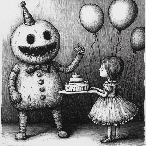 Create an eerie yet whimsical scene in the style of Edward Gorey. Depict a surreal celebration featuring an oversized gingerbread figure and a doll-like girl offering a cake. Use intricate cross-hatching to capture every detail of the balloons, candies, and whimsical decorations. The gingerbread figure should have an unsettling smile, blending joy with subtle menace. The child is motionless, evoking a sense of innocence mixed with detachment. The background should be minimalistic, with shadows suggested through fine lines, creating a sense of emptiness despite the festive decorations. Include symbolic elements--perhaps a pocket watch hidden among the candies or a blackbird peeking from behind the balloons--hinting at time, decay, or forgotten memories. The overall atmosphere should balance between enchanting and unsettling, as if the scene exists in a dream teetering on the edge of a nightmare.