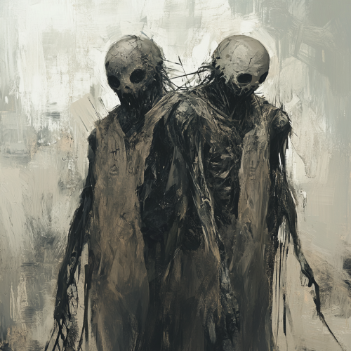Ghastly, humanoid figures dressed in tattered clothes. Their faces are obscured by shadows or grotesque features. They appear as if they’ve been stuck in the environment for a long time.