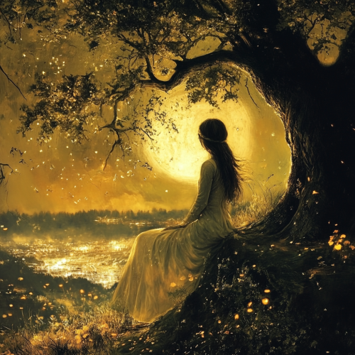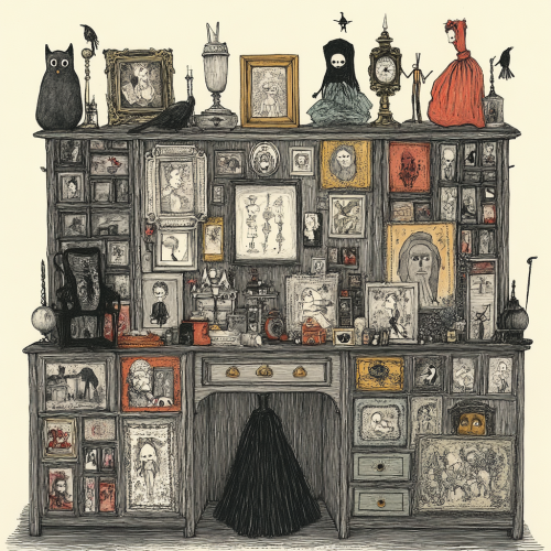 Create an intricate illustration in Edward Gorey’s style, depicting a theatrical scene filled with scattered props, costumes, and whimsical objects. Use meticulous cross-hatching to convey the textures of the various items--delicate fabrics, intricate doll costumes, and ornate picture frames. Each object, from miniature furniture to drawings of fairies, should appear carefully placed yet slightly chaotic, giving the impression of an abandoned or forgotten stage. Incorporate a mysterious figure partially hidden behind the desk, with only elegant legs visible beneath it, adding an element of narrative ambiguity. The characters depicted in the paintings and figurines should resemble Gorey’s signature style--neutral expressions, elongated proportions, and fantastical elements--evoking both playfulness and subtle menace. Use a minimal background to focus attention on the cluttered display, allowing shadows and negative space to heighten the sense of tension and isolation. Subtle symbolic motifs, such as a small ticking clock or a bird perched on a prop, should hint at themes of time and memory. The composition should feel both whimsical and unsettling, capturing the eerie beauty and ambiguity that define Gorey’s storytelling.