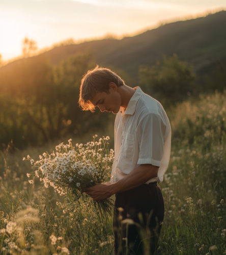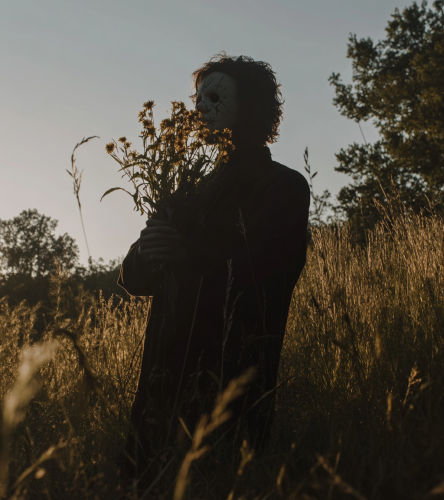 a cinematic wide shot image of a 1980s slasher movie maniac killer standing in a grassy hillside and holding a bouquet of freshly picked wildflowers at his side, he facing the camera and tilting his head to the side in a romantic pose, Fujifilm X-H2S, golden hour, perfect hands, ironic, hi-res, hyper-real --ar 8:9
