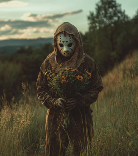 a cinematic wide shot image of Jason Vorhees in the burlap hood from Friday the 13th Part 2 standing in a grassy hillside and holding a bouquet of freshly picked wildflowers at his side, Fujifilm X-H2S, golden hour, perfect hands --ar 8:9