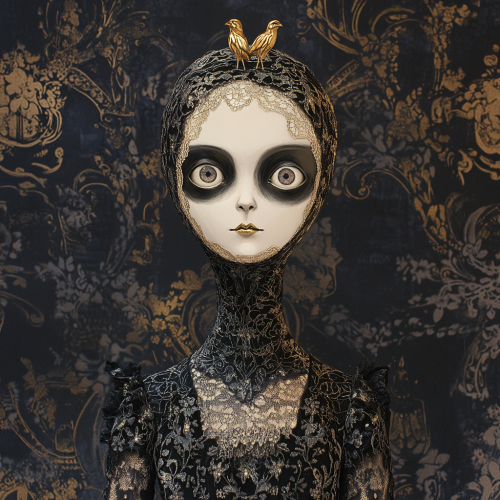 Create an intricate illustration in Edward Gorey’s signature style, depicting a solitary woman with flowing, dark hair, standing against the backdrop of a grand, gothic window. Use meticulous cross-hatching to emphasize the shadows and textures in her lace-adorned dress, capturing the delicate yet intricate patterns. The woman’s posture should convey a quiet stillness, her expression emotionless and detached, evoking a subtle air of melancholy and mystery. The stained-glass window behind her should feature abstract and symbolic motifs, such as clock faces, spiraling patterns, and ghostly birds, suggesting the passage of time or themes of isolation. Each pane of the stained glass should be rendered with careful linework, emphasizing both structure and fragility, while the interplay of light and shadow adds depth to the scene. Use negative space intentionally, leaving areas unfilled to heighten the sense of emptiness and tension that permeates the scene. The overall composition should feel hauntingly elegant, where the ornate lacework of the woman’s dress contrasts with the mechanical precision of the stained-glass background. Let the gothic elements subtly allude to themes of longing and detachment, capturing the eerie beauty and narrative ambiguity typical of Gorey’s work.