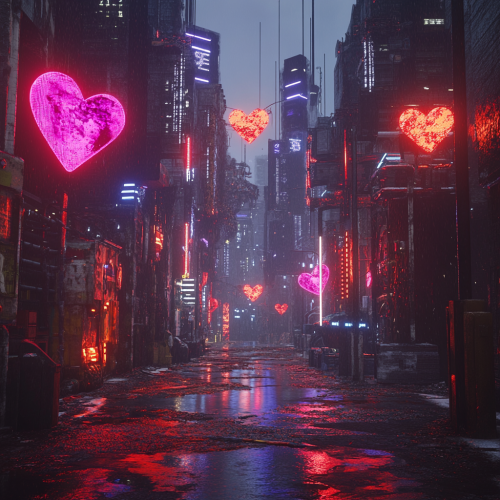 center of a cyberfuturistic city at the main street. A broken heart themed city with red and purple neon lights. Heartbreak city night time broken hearts. Horror theme. UHD, Super Detailed, High Definition, Photographic style, dramatic cinematography, photorealistic, epic composition Unreal Engine, Cinematic, Color Grading, portrait Photography, Ultra-Wide Angle, Depth of Field, hyper-detailed, beautifully color-coded, insane details, intricate details, beautifully color graded, Unreal Engine, Cinematic, Color Grading, Editorial Photography, Photography, Photoshoot, Depth of Field, DOF, Tilt Blur, White Balance, 32k, Super-Resolution, Megapixel, ProPhoto RGB, VR, Halfrear Lighting, Backlight, Natural Lighting, Incandescent, Optical Fiber, Moody Lighting, Cinematic Lighting, Studio Lighting, Soft Lighting, Volumetric, Contre-Jour, Beautiful Lighting, Accent Lighting, Global Illumination, Screen Space Global Illumination, Ray Tracing Global Illumination, Optics, Scattering