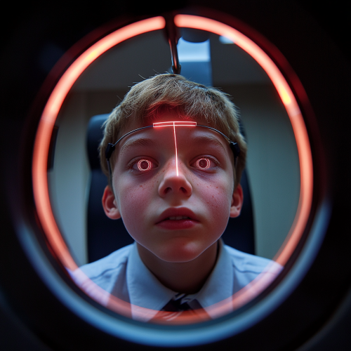 a 10 year old male student wearing private school uniform is having his face scanned by an invasive laser face scanner that holds his head still in a mechanical contstraint. Wide angle lens. facial closeup. Frightened face. --aspect 1:1 --v 6.1