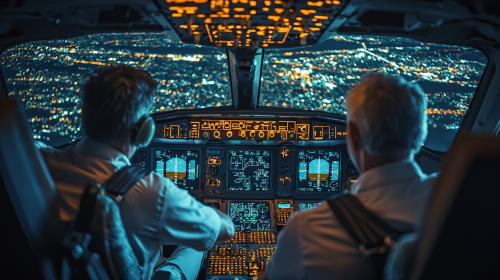 Pilots are flying a commercial plane, cockpit scene, their expressions are frightful and a bit of scared, White Balance, 32k, Super-Resolution, Megapixel, Pro Photo RGB, VR, perfect eye lashes --ar 16:9 --s 250 --style raw --v 6.1 --q 2