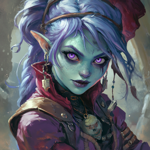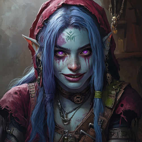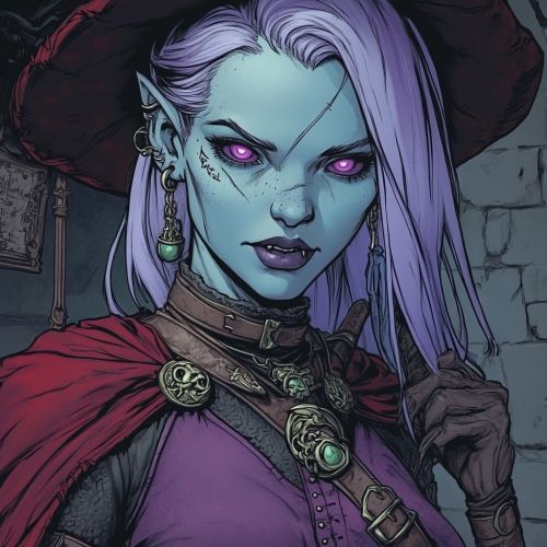 dungeons and dragons, fantasy, illustration, comicbook artstyle, half body portrait, staring at the camera with a crazy wide eyed stare, she has a wicked smile and mad wide eyes, she looks murderous, young female orc with light blue skin, bright purple eyes, purple hair with ghostly green tattoos, wearing oversized crimson monk cloaks, she wears a high military style collar that covers her lower face and mouth, and wears a wide brimmed witch hat, on her clothes are hanging tomes and vials, big muscles, madness, dominant, angry, sinister, v6.1 --v 6.1