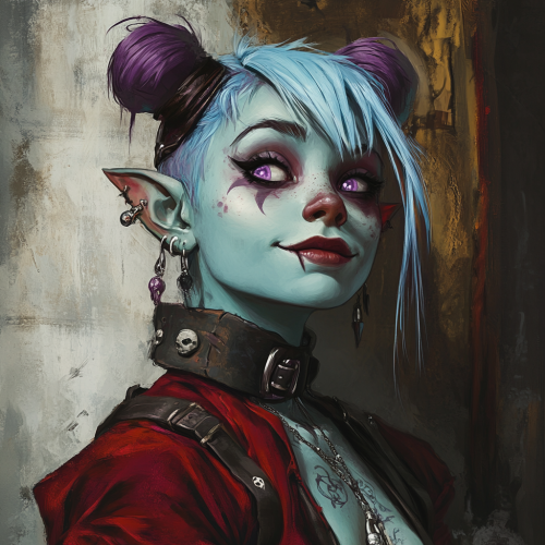 dungeons and dragons, fantasy, illustration, kawaii, graffiti, staring at the camera with a crazy wide eyed stare, she has a wicked smile and mad wide eyes, she looks murderous, young female orc with light blue skin, bright purple eyes, purple hair with ghostly green tattoos, wearing oversized crimson monk cloaks, she wears a high military style collar that covers her lower face and mouth, and wears a wide brimmed witch hat, on her clothes are hanging tomes and vials, big muscles, madness, sinister, v6.1 --v 6.1