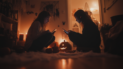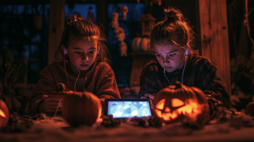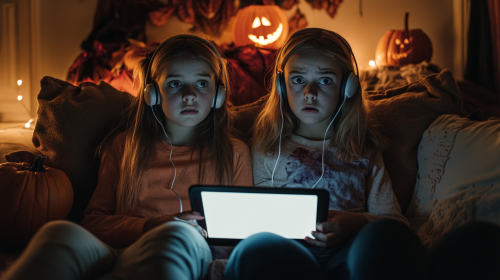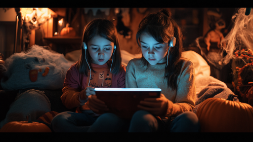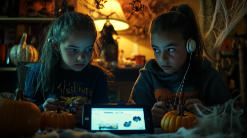 Movie still, documentary photography, editorial, in the style of Martin Parr: two womens, are sitting together in a dimly lit room with Halloween decorations--pumpkins, cobwebs, and spooky ornaments scattered around. They are intently listening to a horror podcast on a tablet placed between them, each wearing wired earbuds. The room is illuminated by soft, Halloween lighting, enhancing the mood of fear and excitement. High level of detail, cinematic light, 35mm, intricate details --ar 16:9