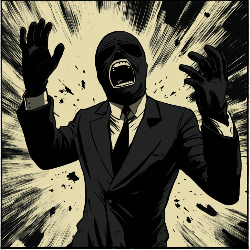 a man in an elegant yet simple black suit and a black leather glove on his right hand. His face is covered by a black ski mask. He is screaming --niji 5