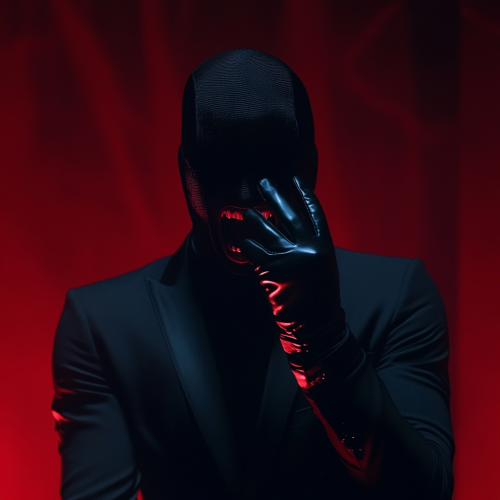 a man in an elegant yet simple black suit and a black leather glove on his right hand. His face is covered by a black ski mask. He is screaming. Dark background with neon red lighting