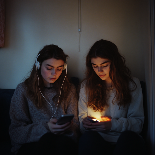 movie still, documentary photography, a editorial, Martin Parr style shoot of Two young women sitting side by side in a dimly lit room, sharing a single headphone while intently looking at a phone held between them, listening to a horror podcast. Their expressions are filled with fear, eyes wide as they absorb the chilling audio. The room is shrouded in shadows, with soft light casting eerie shapes on the walls. The atmosphere is tense and suspenseful, enhanced by subtle details like flickering candles or ghostly shadows. High level of detail, dramatic lighting, and an overall sense of dread High level of detail, realistic lighting and orange halloween light documentary photography, 35mm