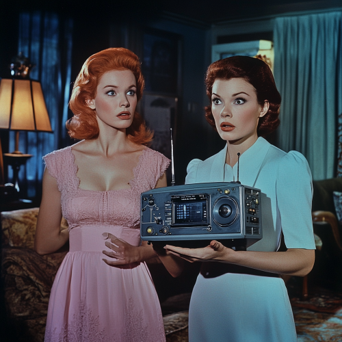 mage in the style of the original Twilight Zone, colorized, of 2 women standing in a living room at night. The 1st is a woman with light red hair with a shoked expression on her face, wearing a pink maxi-dress. The 2nd woman has dark hair with a small grin on her face, is wearing a light gray business dress, and holds in her hands a radio-controller with an antenna.