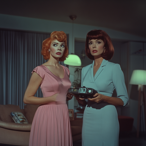 mage in the style of the original Twilight Zone, colorized, of 2 women standing in a living room at night. The 1st is a woman with light red hair with a shoked expression on her face, wearing a pink maxi-dress. The 2nd woman has dark hair with a mischivious expression on her face, is wearing a light gray business dress, and holds in her hands a radio-controller with an antenna.