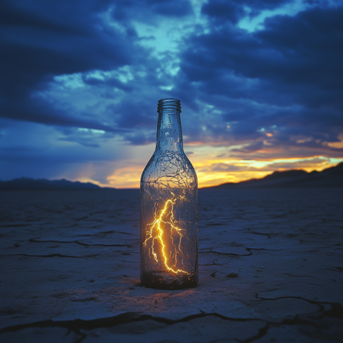 a bottle with lightning captured in it the bottle is in jean dry lake bed. The crack should feel worrisome. It should convey that the lighting will soon escape