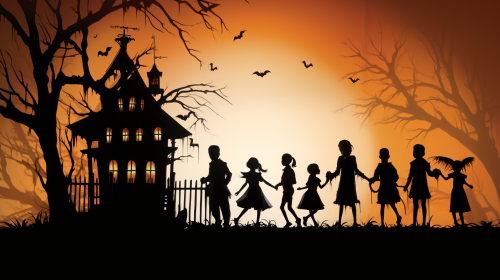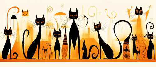 1920s design style, halloween cats, orange and black color themes, whimsical, white background --ar 7:3