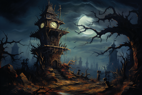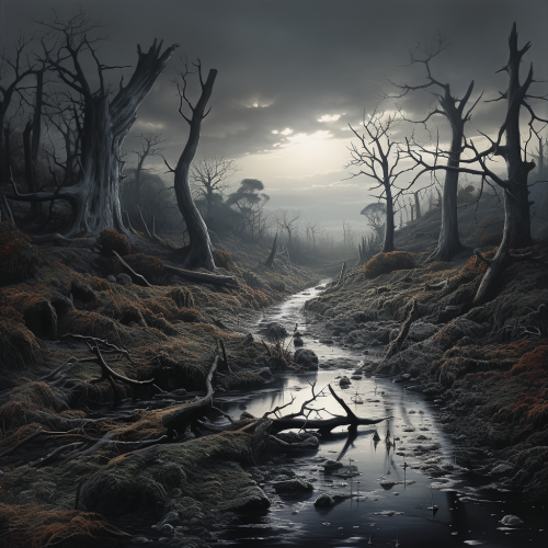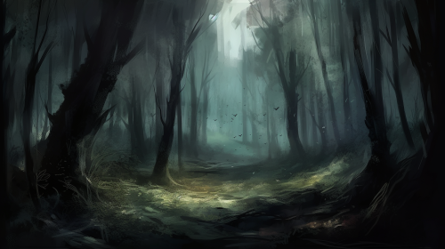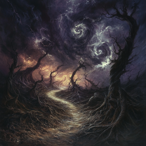 A dark, surreal landscape with a winding, twisted path that snakes through the scene. The path is lined with gnarled, contorted trees, their branches spiraling unnaturally into the sky. In the distance, a distorted, eerie figure stands with its limbs bent in unnatural angles, casting long, warped shadows. The sky above is a stormy swirl of dark purples, blacks, and streaks of lightning. The entire scene feels chaotic and distorted, with a sense of unease and tension, evoking madness and inner turmoil. Dark, moody colors with a nightmarish vibe.