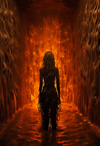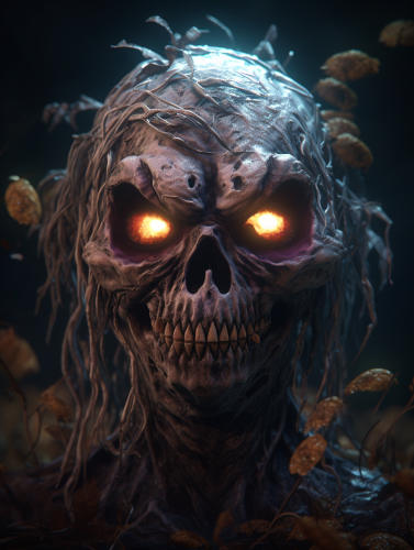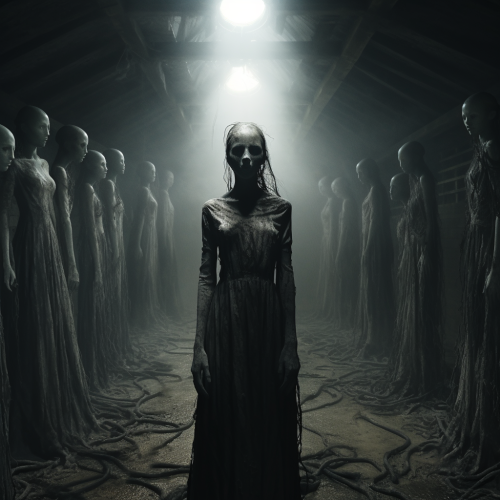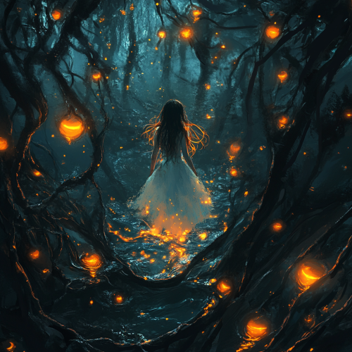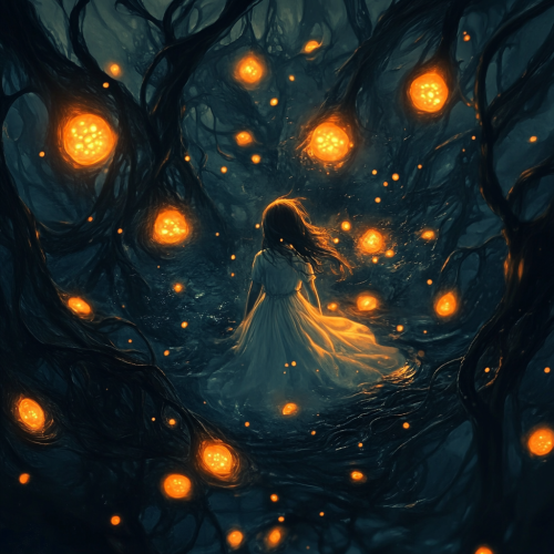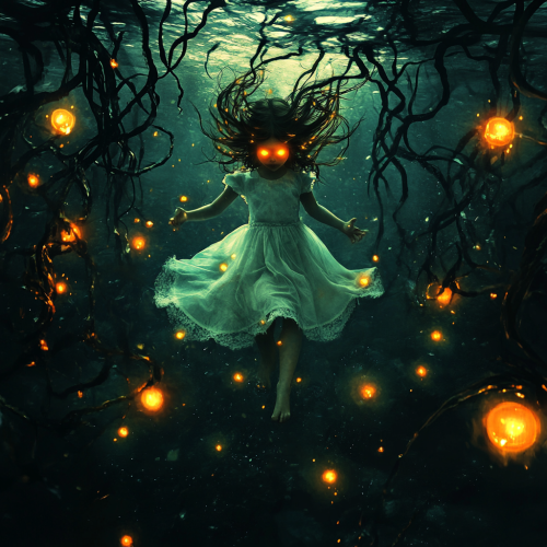 horror, realistic, contrast, in the depths of deep, dark, water, writhing vines with small orange lights flowing from the center. Large brainlike nodules float among the vines. Floating in the center, the lights coalesce around a young 8 year old girl in a white dress with long hair and glowing eyes