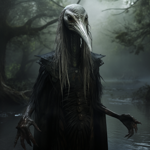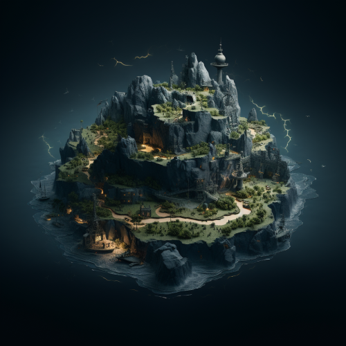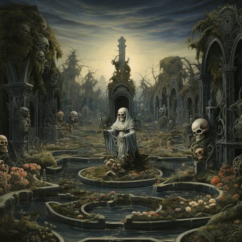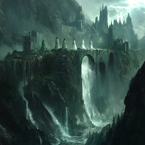 a destroyed kingdom that had been ruined by floods and taken over by muck it takes place in a mountain range and is a dark fantasy Lott dark souls style the kingdom is emerald green amongst the ruins are princesses corrupted by muck who roam they are wearing white dresses and have full face masks
