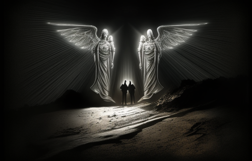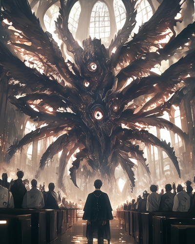A terrifying monstrous Angel made of eyes and angelic wings appearing before a crowd in a catholic church behind the Bishop, the bishop summoned the angel to speak at the church to the parishioners, Anime style, textured, clear, bold, gorgeous color, --ar 4:5 --s 250 --style raw --niji 6