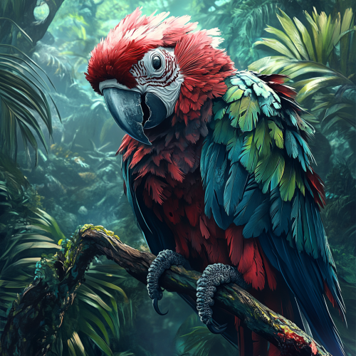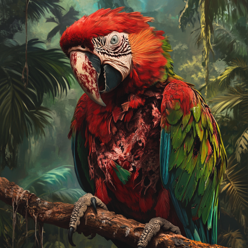 a zombie macaw parrot. Its feathers are somewhat ruffled, and its skull is partially visible. It is perched on a branch close to the viewer with a lush tropical background.